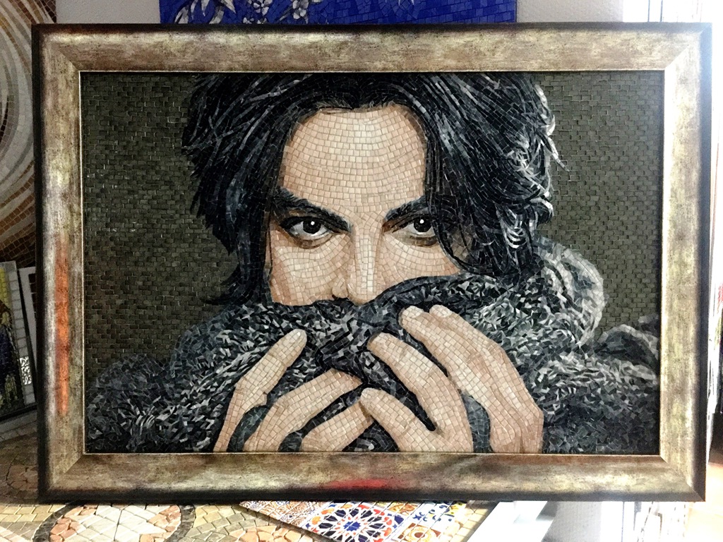 Мозаичный портрет Народного Артиста России Филиппа Киркорова. Портрет выполнен в художественной сборке мозаики. Размер портрета 1200*800 мм. При изготовлении портрета была использована мозаика ведущей мировой Компании Sicis (Италия). Багет изготовлен из Африканского легкого дерева Аюз (производства Италия). Мозаичный портрет это монументальное искусство.
